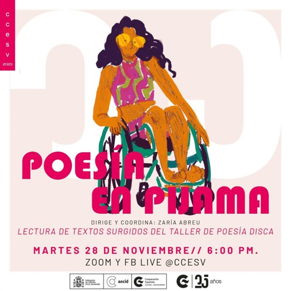 El martes 28 de noviembre a las 6:00 p.m. sigue a través del  Facebook Live del Centro Cultural de España en El Salvador (CCESV) Poesía en Pijama, un espacio en el que se compartirán los textos que surgieron en el Taller Online Poesía Disca, celebrado en septiembre de 2023 y dirigido por la escritora y guionista mexicana Zaría Abreu.