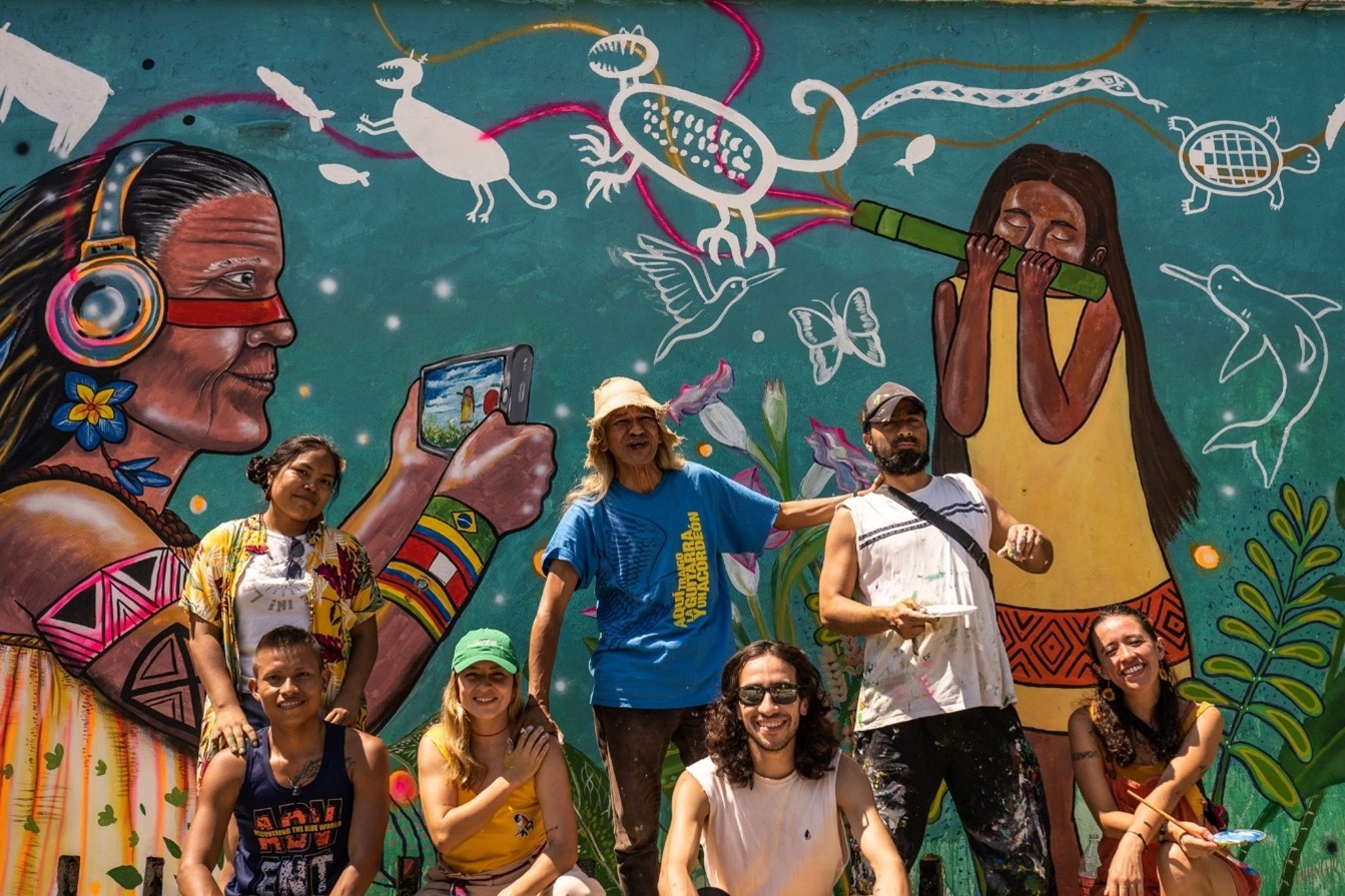 FOTO: Intervención mural realizada en el Banco de la República, sede del Encuentro en Leticia, por un grupo de jóvenes creadores lidereado por Francy Silva, artista Murui; William Ahue, del Pueblo Magüta; y Andres Domínguez, artista de Leticia. © Andrés Cardona, Fundación VIST