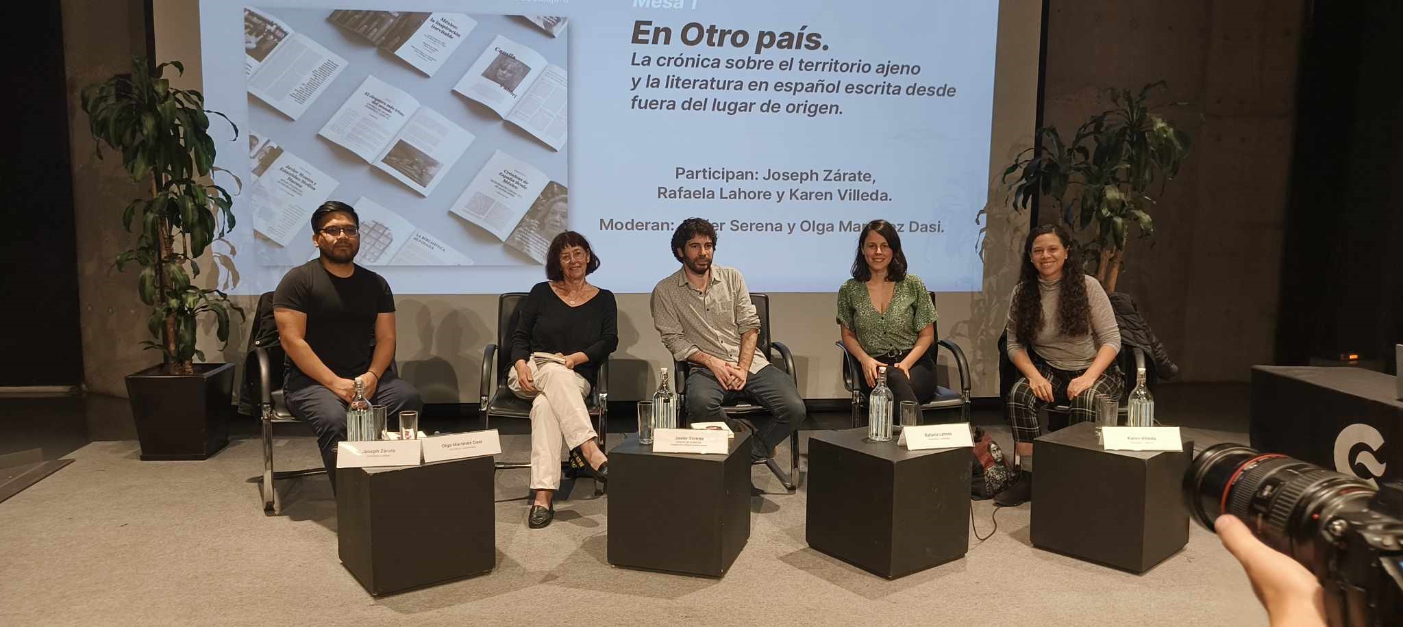 La inauguración tuvo lugar el 25 de junio con unas palabras de bienvenida que dieron paso a la mesa “En otro país. La crónica sobre el territorio ajeno y la literatura en español escrita desde fuera del lugar de origen”. El periodista y editor Joseph Zárate, junto a la también periodista y escritora Rafaela Lahore, y la autora mexicana Karen Villeda, presentaron la antología de crónica recientemente publicada por Candaya y promovida por la AECID, en una charla moderada por el director de Cuadernos Hispanoamericanos, Javier Serena, y la profesora y escritora Olga Martínez. ‘En otro país’ reúne textos de no-ficción de doce cronistas menores de 40 años y orígenes geográficos distintos: Argentina, Colombia, Cuba, Ecuador, El Salvado, España, México, Perú, Puerto Rico y Uruguay. Esta mesa giró en torno a la escritura en español, a menudo escrita fuera de su lugar de origen. Bien sea por exilios políticos o económicos, por razones personales o bien por la existencia de una amplia geografía en español, la literatura en español ha podido escribirse con esa distancia con el origen, y de ahí una de sus variedades y riquezas.