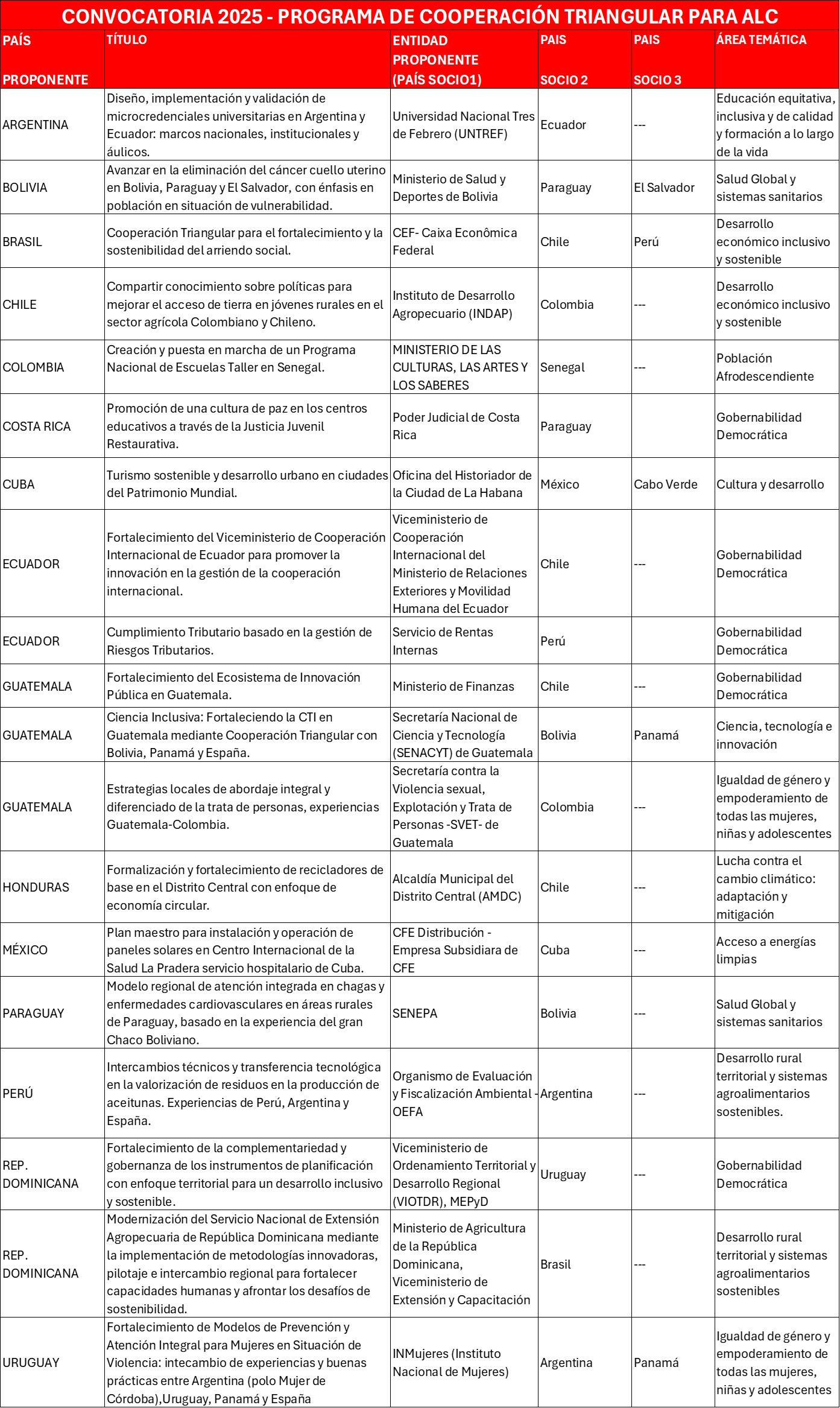 Las Entidades Proponentes, instituciones públicas de países de América Latina y el Caribe de los distintos niveles de la Administración, presentaron sus propuestas a través de las Agencias o Direcciones de Cooperación de sus países.